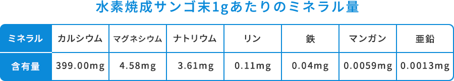 海の大自然の恵みである化石サンゴを使用した水素焼成サンゴ末には、豊富なミネラルがバランスよく含まれています。ミネラルは、体の組織をつくる原料であり、体の働きを維持・調節する働きを持つ、生命活動に不可欠な栄養素です。ピュアアッシュは多種のミネラルを同時に補給できることが魅力です。中でもカルシウムが最も多く含まれていますが、カルシウムは骨や歯の形成以外にも、筋肉、血液、神経などにも欠かせません。