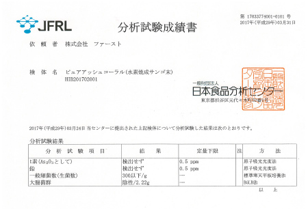 ピュアアッシュの原料である水素焼成サンゴ末は、日本食品分析センターにおいて安全性等の不純物は含まれておらず、健康に問題ない安全な商品ということが証明されています。